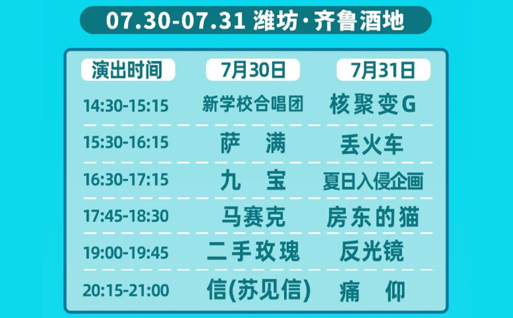 新青年,新思想,新血液,新視聽!7月30日至31日,2022濰在線影院坊新青年音樂節將(jiāng)在濰坊齊魯酒地青龍河草坪廣場火熱開(kāi)唱,痛仰、二手玫瑰、丢火影院影院車、馬賽克、房東的貓、夏日入侵企畫、信等一衆實力實力歌手及樂隊美麗TV組合將(jiāng)輪番登台,為你打造兩(liǎng)天的音樂狂歡派對(duì)!