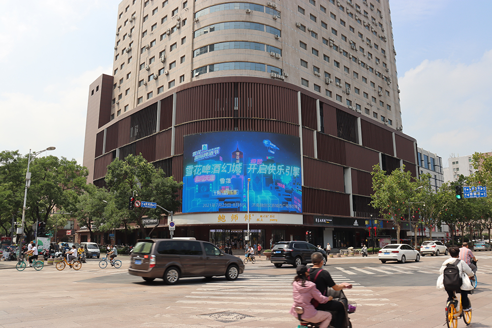 (雪花國(guó)際啤酒節投放“泉眼”泉城路齊魯國(guó)際大廈戶外高清影院LED屏廣告)