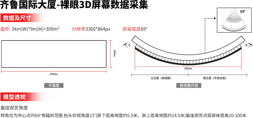 【最佳角度】大屏弧面(miàn)轉角為中心點,距屏≧30m距離、擡頭仰視角度20°-45°
