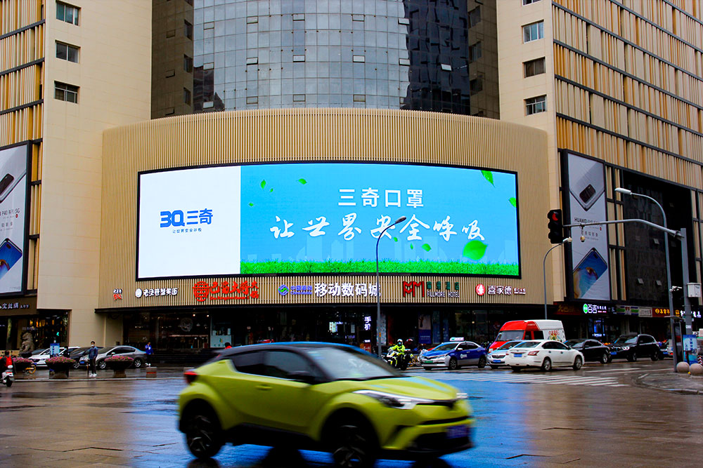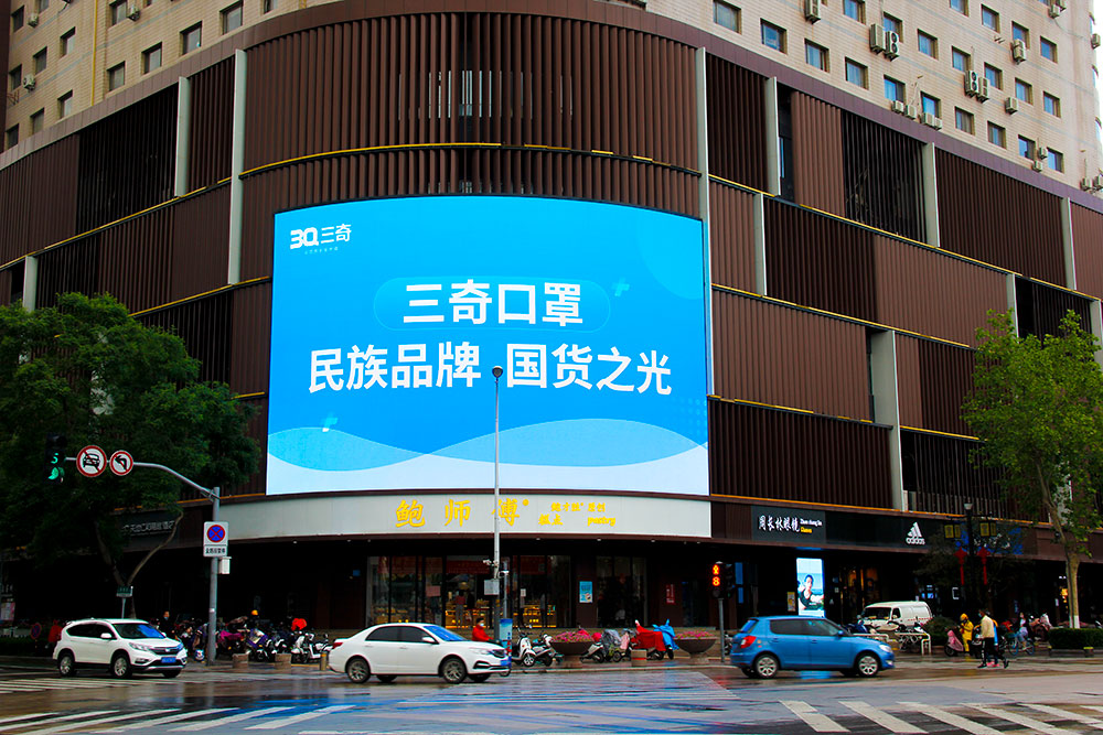 (三奇口罩投放“泉眼”齊魯國(guó)際大廈戶外LED屏廣告)
